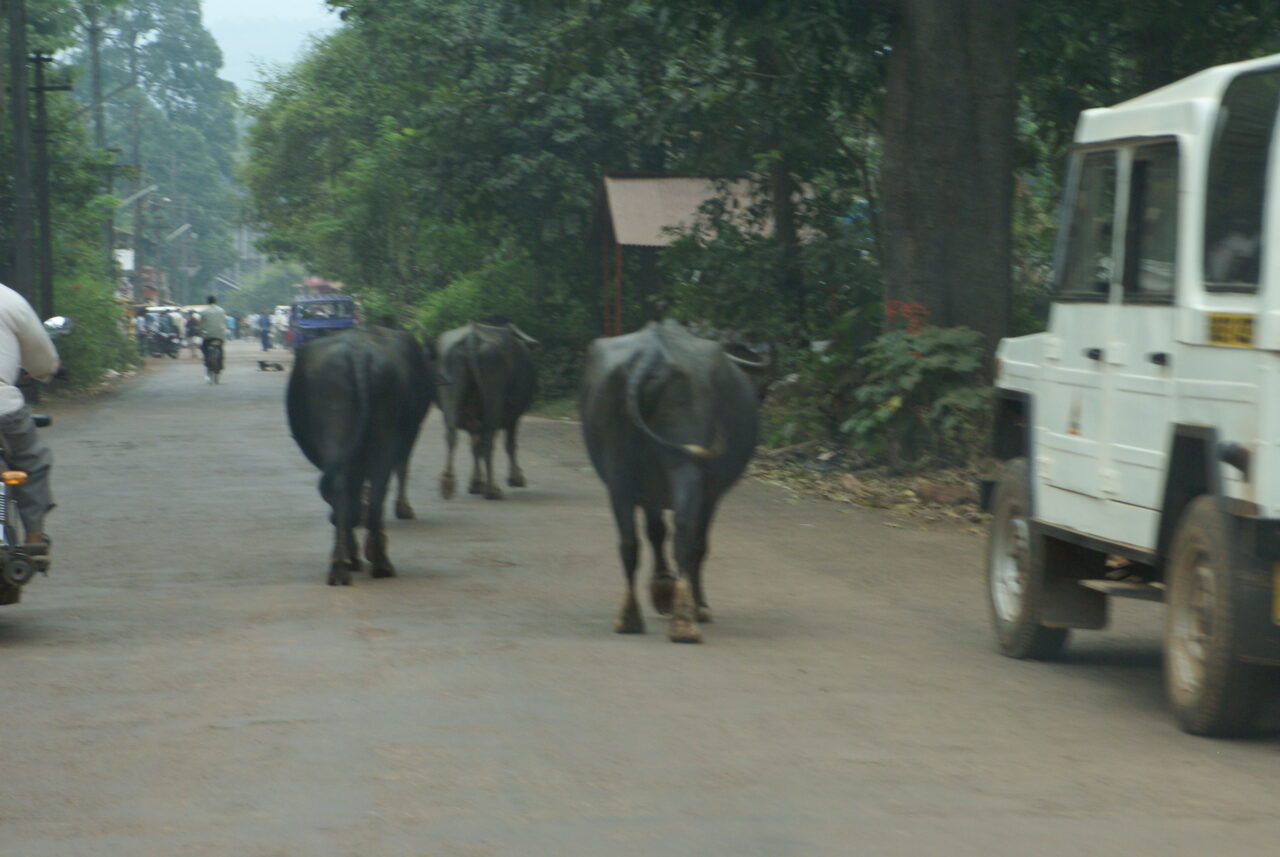 We besloten het later op de dag nog maar eens te proberen en begonnen aan de rit naar het Dudhsagar Water Falls national park, een rit van zo’n 65 kilometer. Ik heb het al eens vaker gezegd, een rit in een taxi in Goa is een avontuur. Maar een rit van 65 kilometer die op deze wegen al gauw een uur duurt is dat zeker. Mocht een Nederlands TV programma als ‘Blik op de weg’ ooit een vakantie aflevering in Goa willen maken, levert dat ongetwijfeld vele spannende uren televisie op. Onze chauffeur haalt in wanneer het kan en ook wanneer het volgens Nederlandse begrippen niet kan. Een maal moest hij vaart zetten en de ingehaalde auto scherp snijden om een frontale botsing met een ertstruck waarvan de chauffeur met een lijkwit gezicht (en dat zegt hier wat!) de taxi op zich af zag komen. En dat was niet de eerste keer, al eerder joeg hij ons de stuipen op het lijf met een dergelijke maneuvre. Niets kan de man echter van zijn stuk brengen, lachend passeert hij al luid claxonerend alle verkeer dat voor hem rijdt. Soms met één hand aan het stuur, met één hand de telefoon aan zijn oor houdend en ondertussen maar inhalen. Ook vlak voor een heuvel lijkt hij te zullen inhalen, even daarvoor was het erg druk. Tot onze opluchting besluit hij toch maar te wachten tot hij meer overzicht heeft. Ook de ‘heilige’ koeien die overal op de weg lopen zorgen soms voor hartkloppende situaties, wij passeren een brommerrijder die vol in de remmen moet om een aanrijding met zo’n dier te voorkomen.