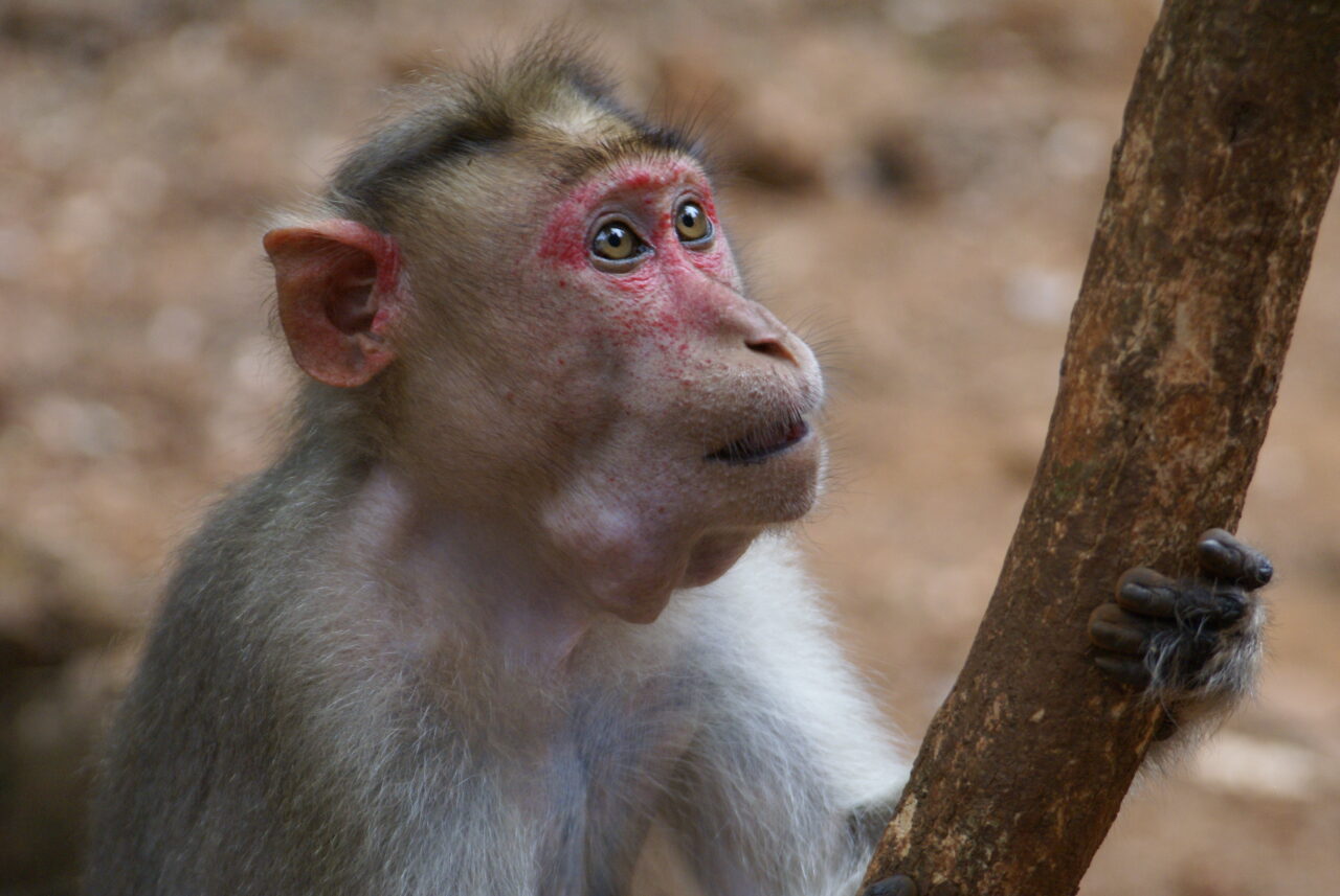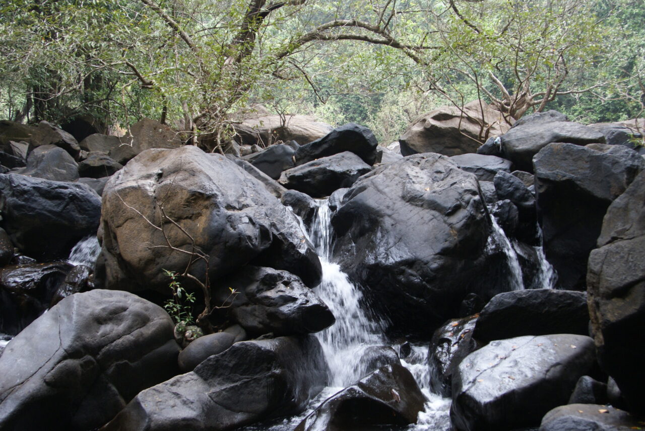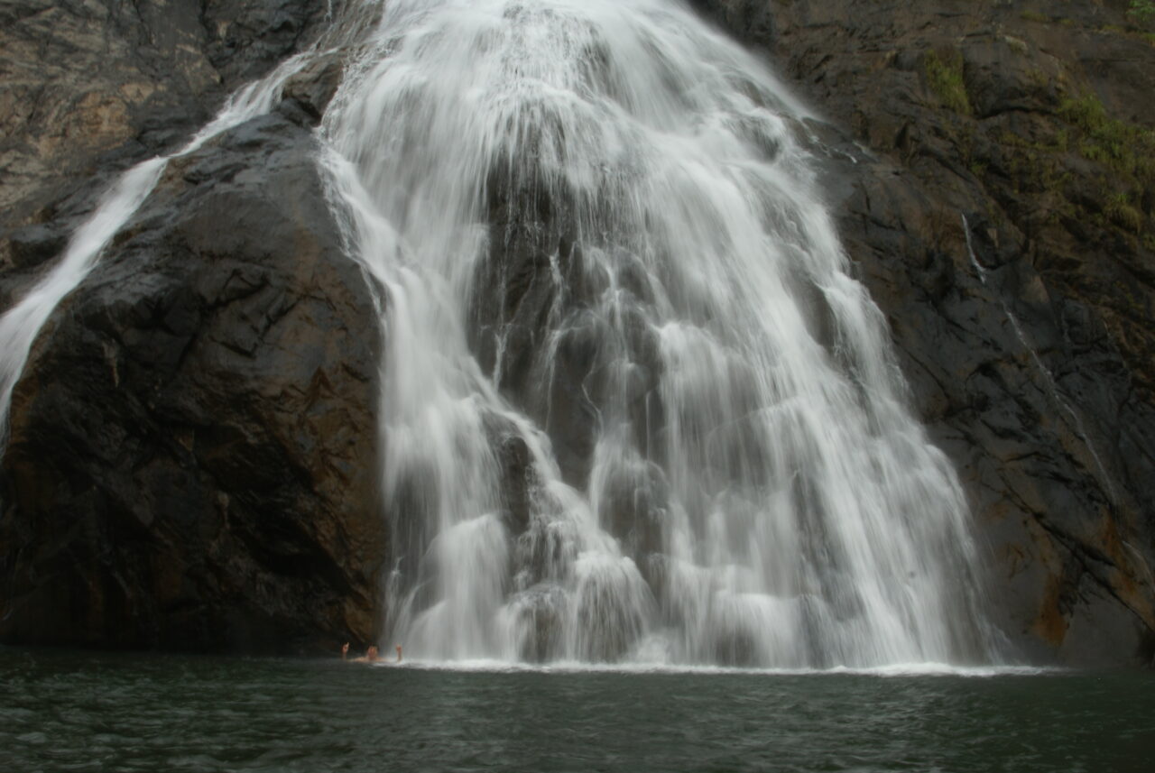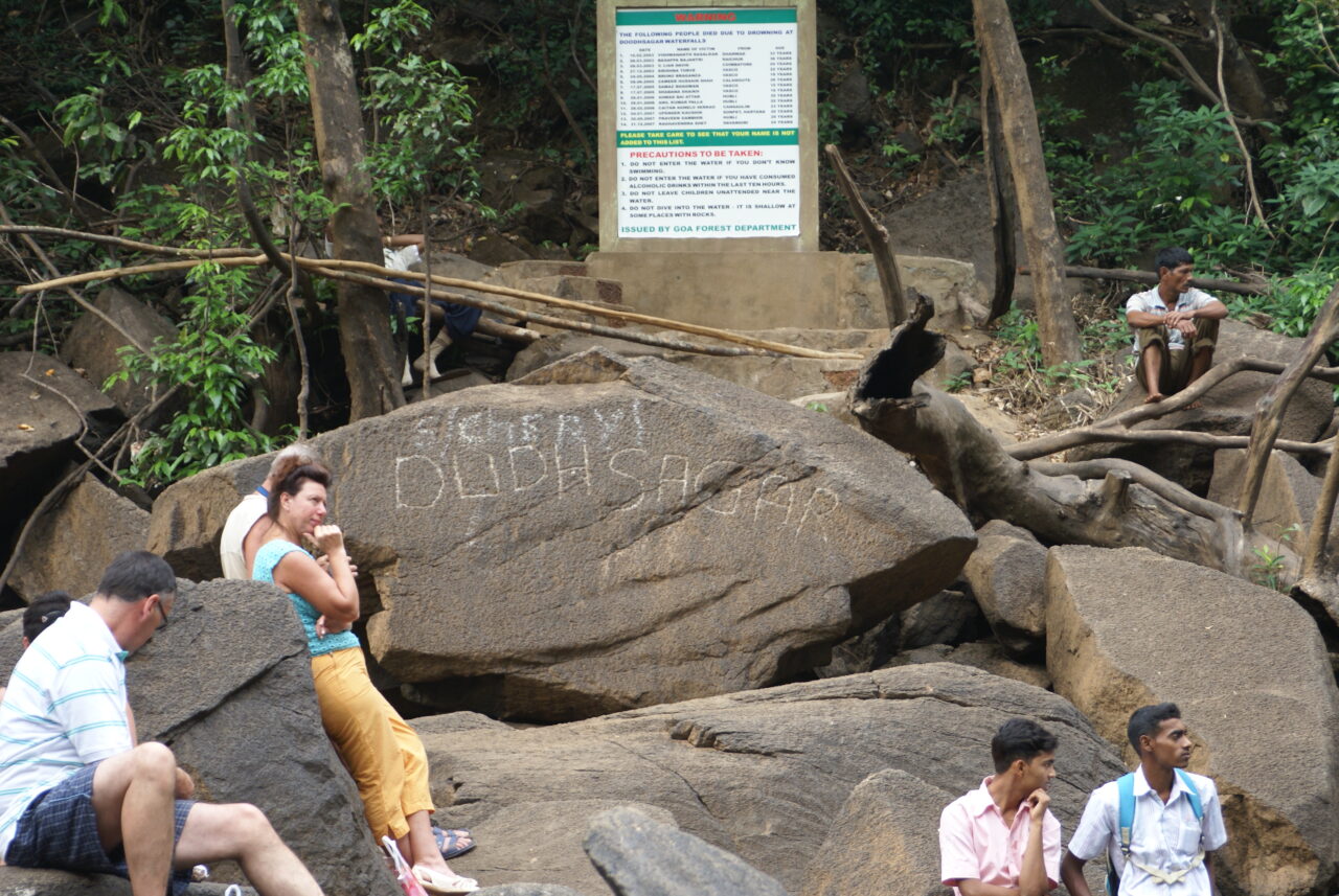 Eindelijk zijn we dan bij de Dudhsagar Water Falls. Dat wil zeggen, we zijn in het nationale park aangekomen. Vandaar moet je een jeep nemen met chauffeur die je naar de Falls brengt. Het is nog een behoorlijk afstand, ongeveer tien kilometer over een volgens de gids die ook in de auto plaats neemt ‘very bumpy road’. We moeten drie maal de rivier oversteken die vanaf de Falls naar beneden stroomt. Onderweg wijst de gids ons, twee Nederlanders, twee Belgen en twee Indiase heren op de bijzonderheden. Spinnen, klein en erg groot, een wat vervallen dorpje met een al net zo vervallen Hindoe tempel, een spoorwegstation dat aan de andere kant van de vallei hoog op een helling ligt, een suikerriet plantage etc. Diezelfde gids regelt trouwens ook de toegang voor het park bij de ingang: twintig roepies per persoon en ook nog eens 30 roepies voor een fotocamera. Hij raadt je ook aan bananen en nootjes te kopen. Nee, niet voor jezelf, maar voor de aapjes die je opwachten op de parkeerplaats bij de waterval. De dieren laten zich de nootjes goed smaken en ook de bananen gaan er wel in.